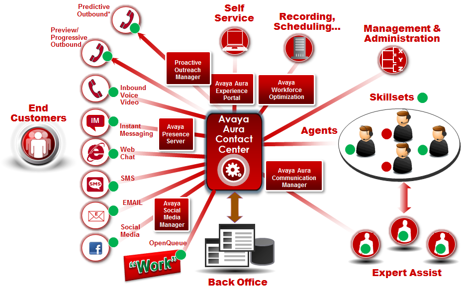 Avaya Aura cung cấp giải pháp kết nối, quản lý phương thức liên lạc (inbound/outbound): voice, email, web chat, SMS, IM, fax và mạng xã hội…giống như phương thức quản lý cuộc gọi vào ra trên hệ thống, với khả năng quản lý tới 5.000 agents